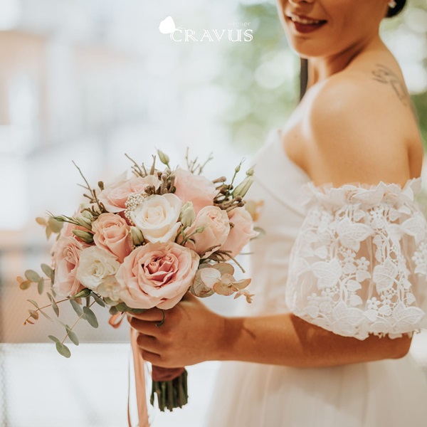 Entre as rosas, toques sutis de flores miúdas e ramos de folhagens em verde como o eucalipto trazem frescor e naturalidade, equilibrando a suavidade das cores com um charme contemporâneo. O resultado é um bouquet etéreo, elegante e atemporal, ideal para noivas que desejam expressar amor, sensibilidade e requinte em cada detalhe do seu grande dia.