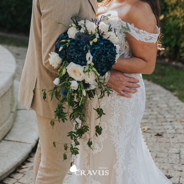 Um ramo que traduz poesia em pétalas. Entre a intensidade sofisticada das hortênsias em tom azul profundo e a delicadeza atemporal das rosas brancas, nasce uma composição que equilibra paixão e serenidade. Os toques de cardo azul e lavanda acrescentam personalidade e textura, enquanto o verde fresco envolve o conjunto com leveza e naturalidade. É um buquê que sussurra promessas eternas, perfeito para noivas que desejam marcar presença com elegância e autenticidade. Romântico sem ser óbvio, clássico com um toque contemporâneo — uma verdadeira declaração de amor em forma de flores.