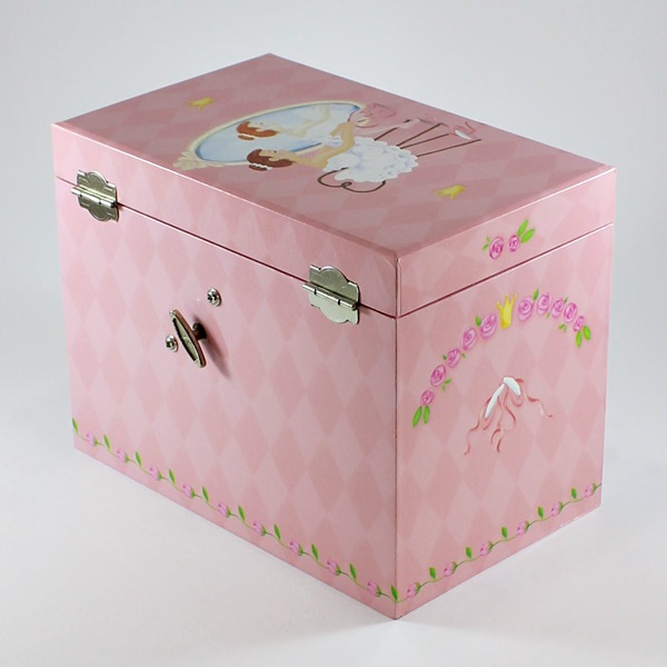 Caixa de música jóias caixa bailarina. A caixa rosa, impresso com belos motivos e flores de balé, é equipado com quatro pequenas gavetas que podem ser abertas e têm espaço para pequenas jóias. Ai abrir a tampa da caixa, uma pequena bailarina aparece na frente do pequeno espelho anexado. Um bolso pequeno e um compartimento grande também podem ser usados. O mecanismo mecânico é montado na parte traseira da caixa. Depois de abrir a tampa, a bailarina gira e a melodia “The Entertainer” soa. Dimensões: 20x14x16 cm.