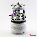 Carrossel em madeira azul. O carrossel bem pintado está equipado com 3 cavalos de madeira. O carrossel na base gira para uma melodia conhecida. Medidas: Ø8×14 cm