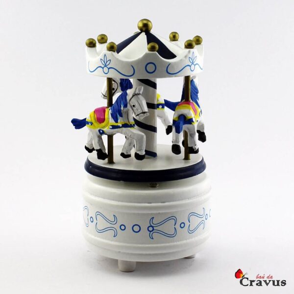 ‘- Carrossel em madeira cor azul e branco. Carrossel roda ao som da música